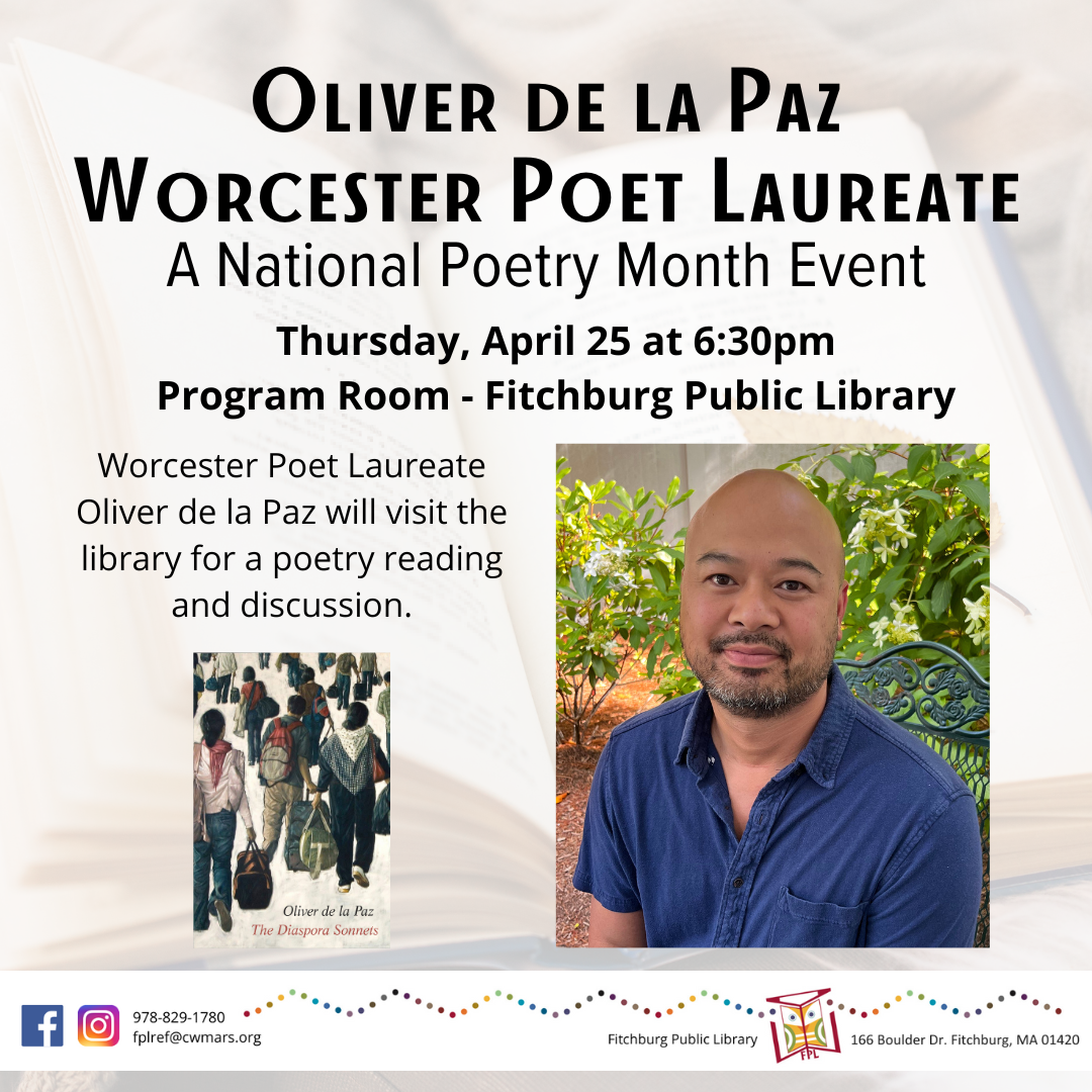 Please join us in celebrating National Poetry Month with a special visit from Worcester Poet Laureate, Oliver de la Paz. Oliver de la Paz is the Poet Laureate of Worcester, MA for 2023-2025. De la Paz has earned degrees in Biology and English Literature from Loyola Marymount University and received his Master of Fine Arts in creative […]