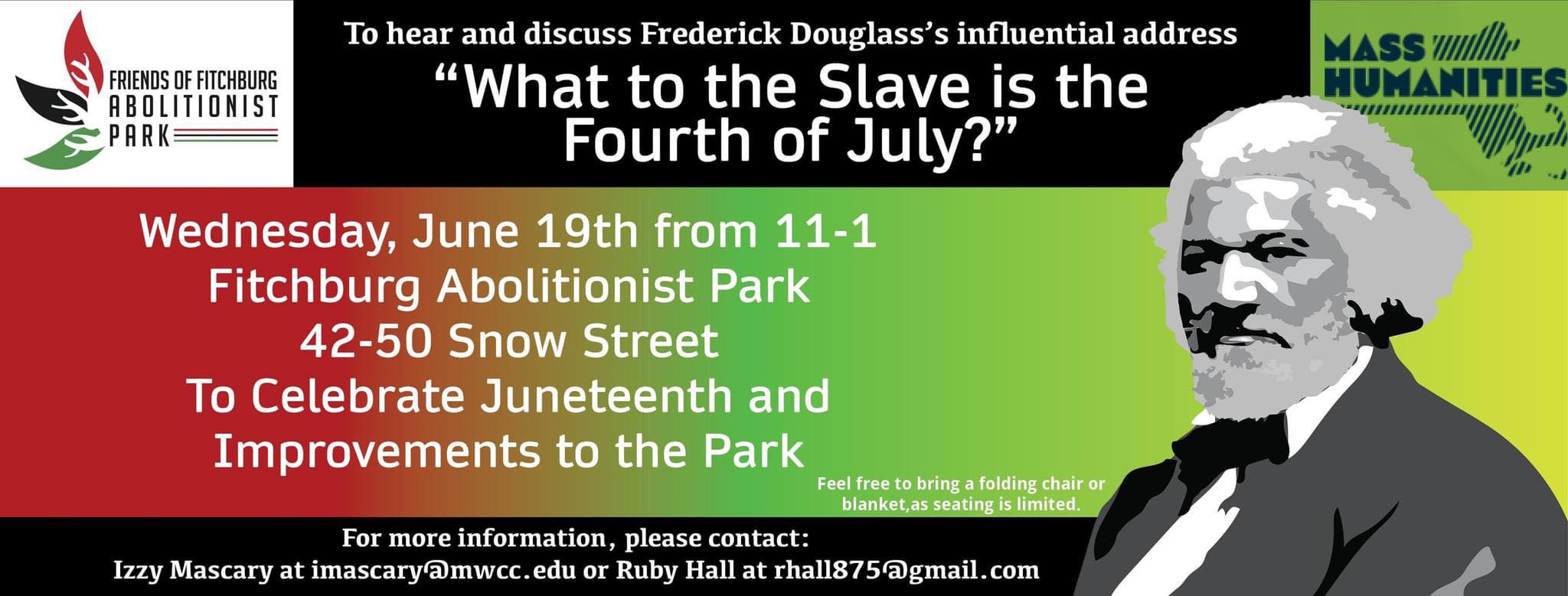 Come Celebrate Juneteenth at Fitchburg Abolitionist Park! - Listen and discuss Frederick Douglass's influential address, "What to the Slave is the Fourth of July?" - Learn about Fitchburg’s connection to the Abolitionist Movement - Celebrate how far we have come in developing and improving Abolitionist Park over the past seven years! Feel free to bring […]