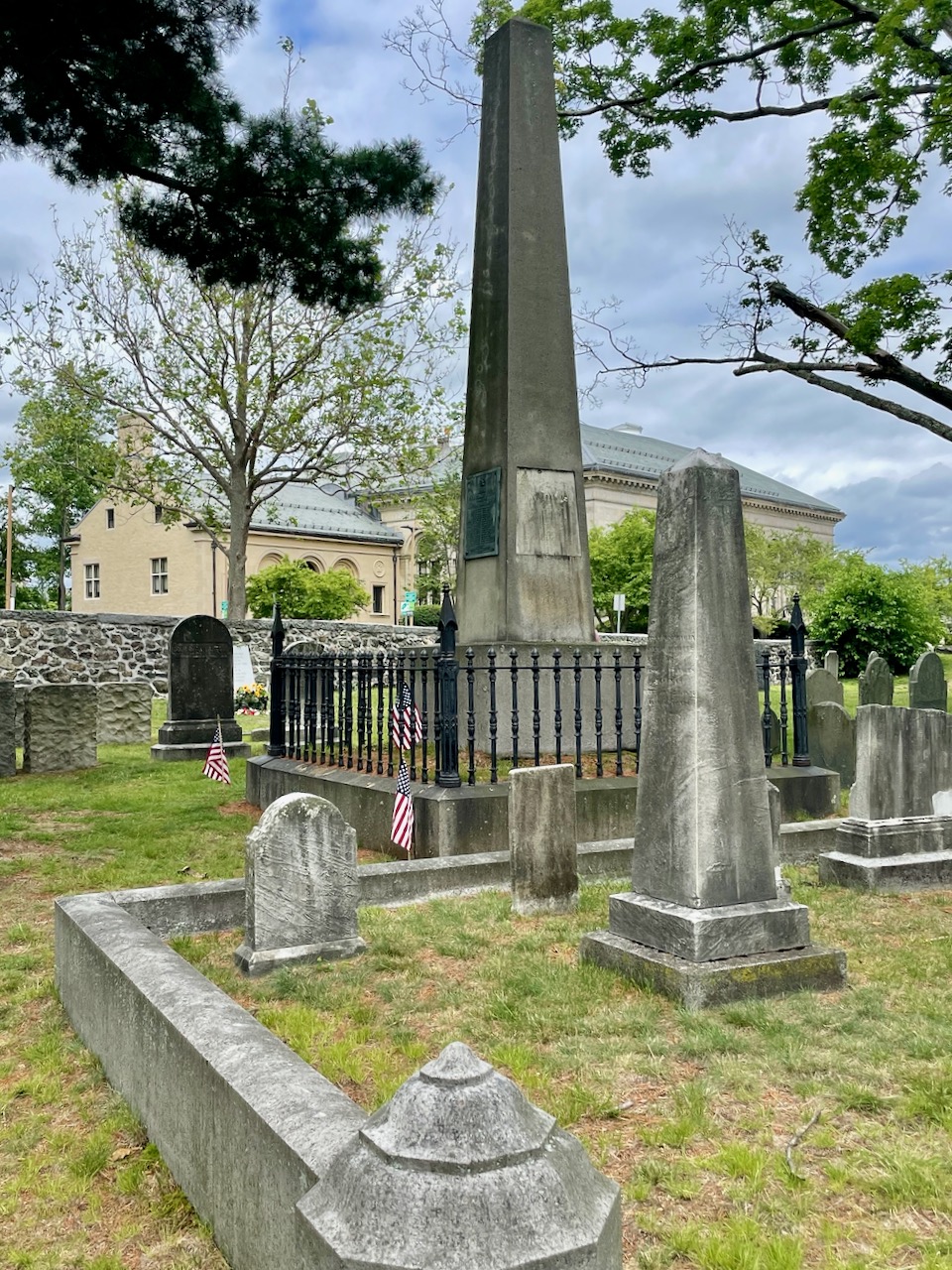 One of the most prominent features of Arlington’s Old Burying Ground is the nineteen-foot-tall obelisk of pure New Hampshire granite encircled by a stone and iron fence, honoring those killed in Menotomy on April 19, 1775, the first day of the Revolutionary War.