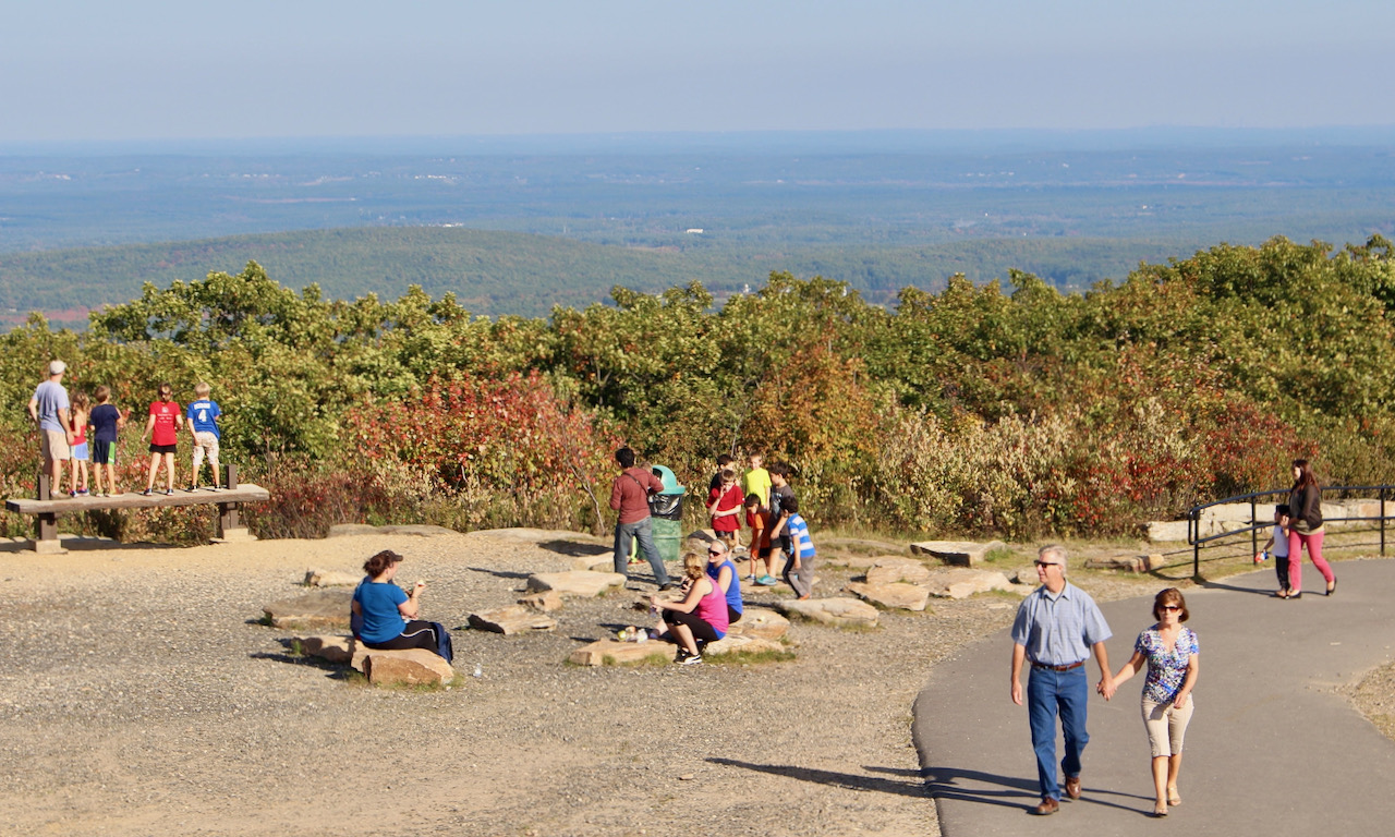 Seventeen miles of hiking and walking trails, including a section of the Midstate Trail, offer a variety of routes to explore. Additional recreational opportunities, including bird watching, cycling, and skiing abound. From the 2,006-foot summit, visitors can enjoy 360° views of the surrounding landscape, including Mount Monadnock to the north, Mount Greylock to the west, and the Boston skyline to the east.
